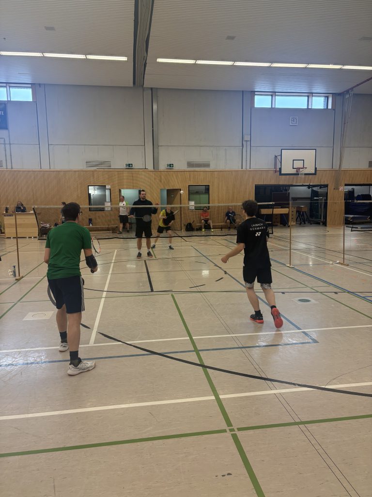 Auch Peter und Lorenz hatten gegen die beiden Asiaten große Probleme und verloren den 1. Satz deutlich (9:21). Nach ein Paar taktischen Anweisungen von Sebi und Basti R. konnten die beiden das Blatt aber unter großer Anstrengung wenden und den 2. Satz für sich entscheiden (21:14). Für noch mehr Präzision und Durchblick auf dem Feld zog sich Peter nun zum 3. Satz auch seine Brille an. Lorenz hingegen nahm sich nach Möglichkeit immer wieder kleine Pausen und nach einer starken Aufholjagd und einem langen (auch mentalen) Kampf im 3. Satz gewannen die Wachtberger das Spiel sogar unter dem Beifall der Spieler auf dem Nebenfeld (21:19)!